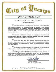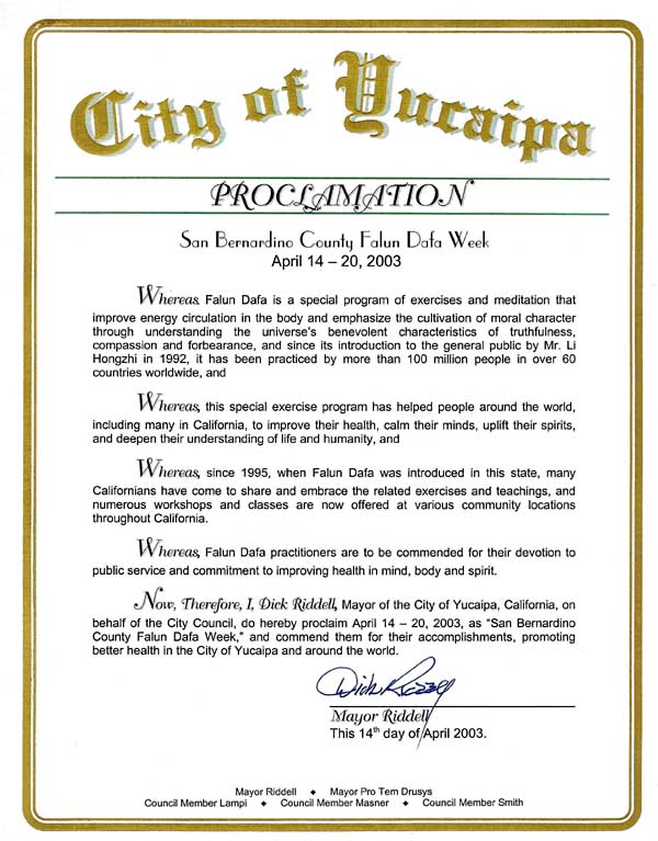 因此,我,加州玉凯帕市市长迪克.李戴尔,代表市议会,特此褒奖2003年4月14日至20日为圣.伯纳迪诺县法轮大法周,赞扬他们在玉凯帕市和全世界为提倡身体健康所获得的成就。