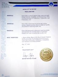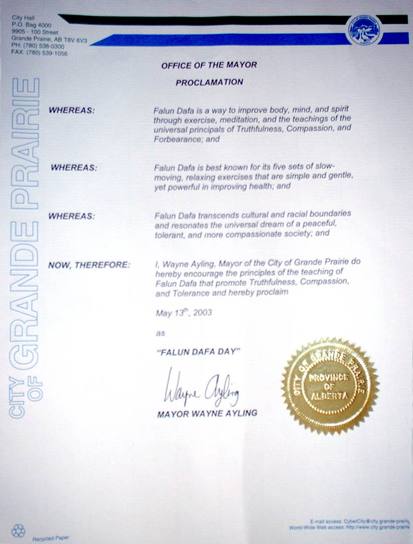 因此,我,大草原市(Grande Prairie)市长韦恩.艾灵,在此鼓励提倡法轮大法所教导的真善忍原则,并宣布2003年5月13日为: