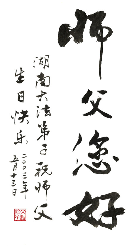在世界法轮大法日来临之际,河南省郑州市全体大法弟子向慈悲伟大的师尊问好:师父,您好!我们想念您!请师父放心,我们一定精进不停,做好师父要求的三件事,并肩携手,共同精进,形成坚不可摧的整体,一定不负师尊的殷切期盼和慈悲苦度。