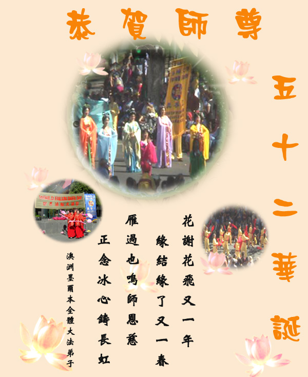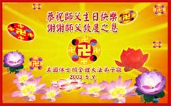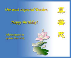 弟子们无法报答师尊的救度之恩,在此表达我们对师尊深深的敬意:师尊您好!师尊您辛苦了!恭祝师父生日快乐!谢谢师尊。请师尊放心,我们一定不会辜负“正法时期大法弟子”的称号。