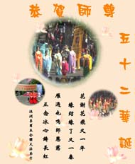 敬爱的师尊,在您五十二周年华诞之际,谨此献上我们即使用千言万语也无法表达的无限感激之情。您的慈悲苦度,您的洪大期望,我们会永远深深铭记。师尊,在这随师正法的道路上,我们一定会走好这最后一步!祝您生日快乐!