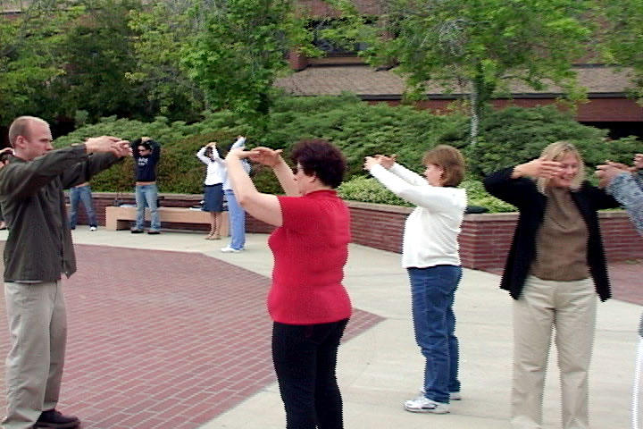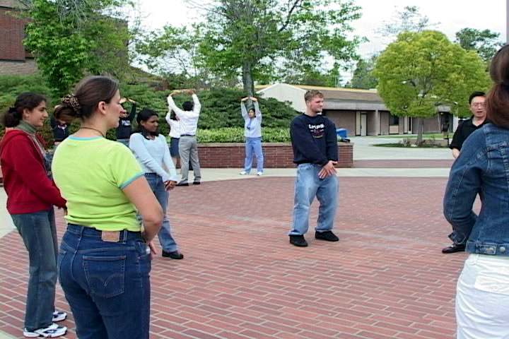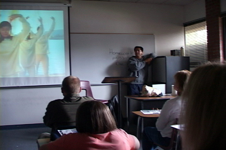 首先,法轮功学员杨先生以他自己的亲身体会,生动地讲述了修炼法轮功带给他的身心变化。他说修炼法轮功使他能在繁重的工作压力下,平静地对待周围的同事。他还介绍了什么是法轮功,解释了中国的江泽民集团镇压法轮功的真正原因是江泽民的嫉妒心所致。接着,学生们又观看了录像,对法轮功自1992年传出以来近十一年的历史有了一个较全面的了解,对法轮功修炼者也有了较清晰的印象。最后,大学生们分成了四个小组,由法轮功学员教功。这些年龄不等、肤色不同的学生们个个学得认真,十分投入。