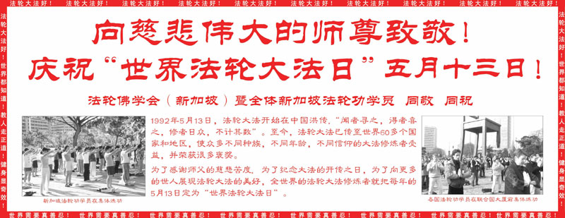 【明慧网2003年5月12日】2003年5月13日是世界法轮大法日。新加坡法轮功学员在新加坡主要的中文报纸《联合早报》上刊登了庆祝世界法轮大法日的广告如下。