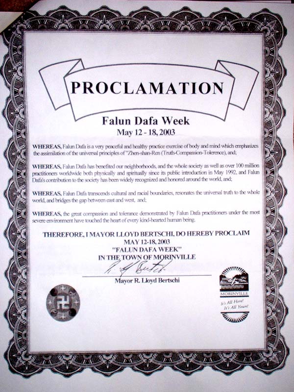 鉴于,法轮大法自1992年5月向社会传出后,使我们的社区,乃至整个社会受益,也使世界上1亿法轮功学员从身心两方面受益。同时,法轮大法对社会的贡献在世界范围内得到广泛的认可和褒奖;并且