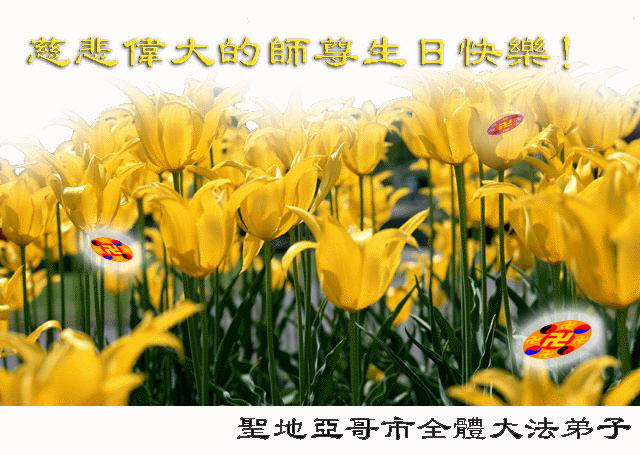 师尊:在您生日即将到来之际,我们怀着无比崇敬的心情对您说一声:师父,祝您生日快乐!人间的语言实在无力而又苍白,用尽辞海中最华丽的词汇也无法表达我们这一刻的心情;只有默默地精进---朝着真善忍的标准迈进、再迈进!我们珍惜这千古难逢的机缘,我们将永远珍惜我们与您同在人间的日日夜夜!