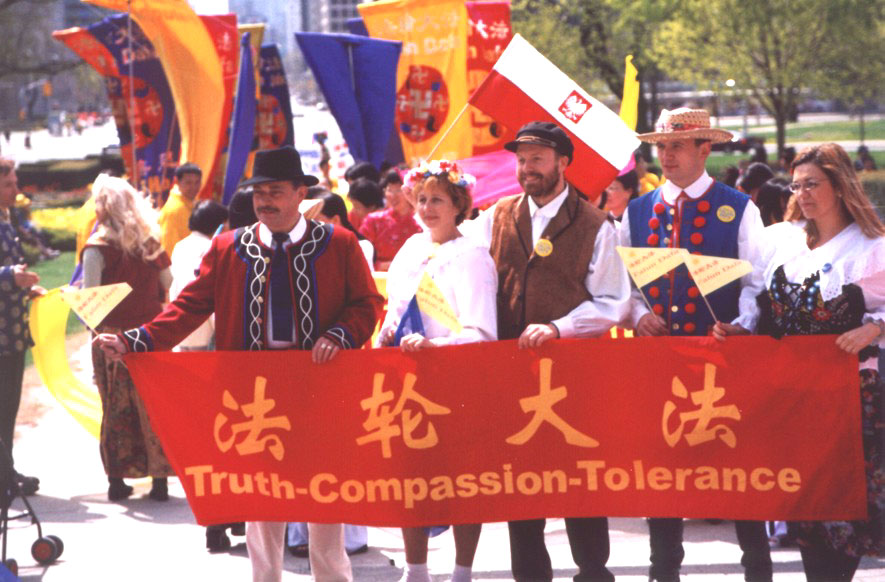 在彩车的后面是身着世界各民族服装的弟子们和挥舞彩带的舞蹈队,代表了法轮大法洪传世界各国。随后是身着黄色大法服装的弟子们的方阵。