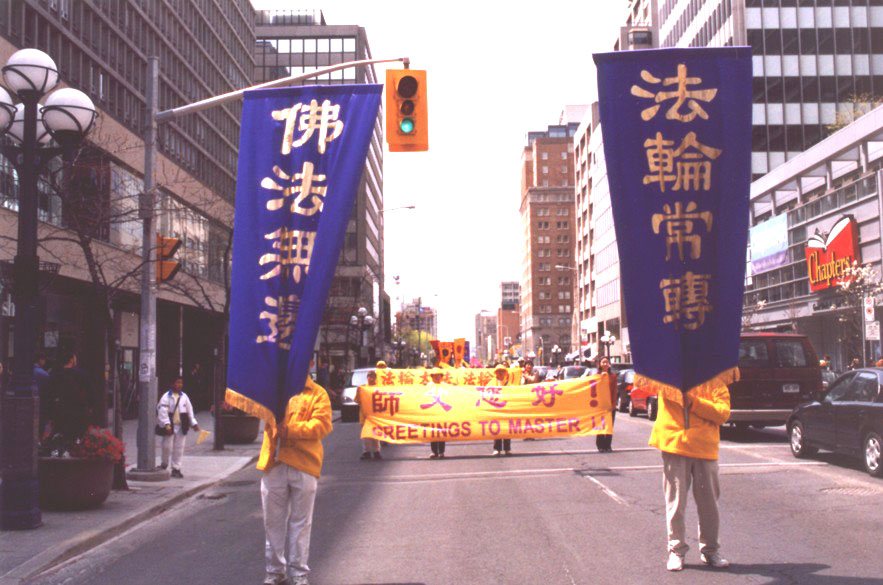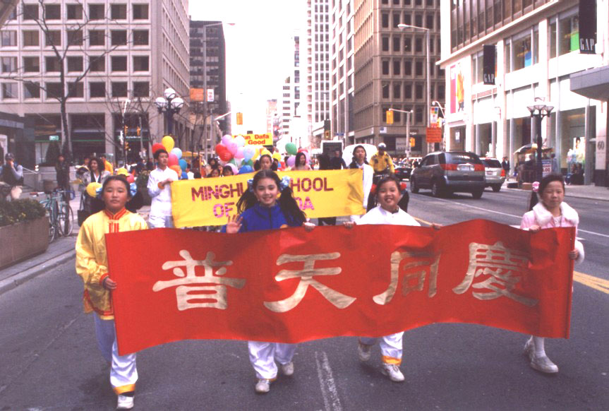 随后,是支持法轮功的民众队伍,举着各色“真善忍”小旗,他们中有支持法轮功的,有刚刚开始学功的,特别值得一提的是,有两个年轻的大学生,看到我们要游行,非常开心,欣然加入我们的游行队伍,跟我们一起走了很久,最后依依不舍的和我们挥手告别。他们说,他们是在这儿长大的华人子弟,看到有这么多的华人游行非常高兴,所以来支持一下。