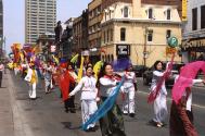 在游行的过程中,始终是阳光灿烂,歌在飞,人在笑,街旁的民众被我们的快乐的游行队伍所感染,不时地向我们挥手致意,连路边的花儿好像也很开心。