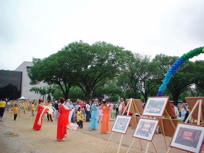 五套大法功法的演示也不断地吸引了许多的行人前来学习。熙熙攘攘的游人在过道两边大法弟子们的艺术表演,功法演示,以及大法图片展中不断地驻足,观看,交谈与参与,大法弟子与世人形成了一片祥和融洽浑然一体的场面。一对西人情侣站在图片前久久不愿离去,看到一位弟子佩带的“我支持法轮功”的胸章时问在哪里能买到,这位弟子慷慨地把自己的胸章给了他,他高兴地说“这令我实在太高兴了。”后来他们去向教功的大法弟子学习五套功法。