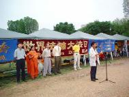 活动由一位西人弟子的致词开始,他首先祝大家世界法轮大法日快乐,并说道“十一年前,人类收到了一份美好独特的礼物。缘分把我们引见给一位无比慈悲伟大的觉者,他把修炼的真谛介绍给了人类,人们再次拥有了一块精神文明的净土,在这里我们选择了真实的生存,从常人的迷茫的世界中解脱出来。法轮功的到来使得上亿的人们获得了身心的健康,并且努力同化真善忍。法轮功好,体现真善忍的人好,法轮功为社会带来的影响也很好。”