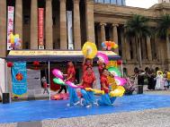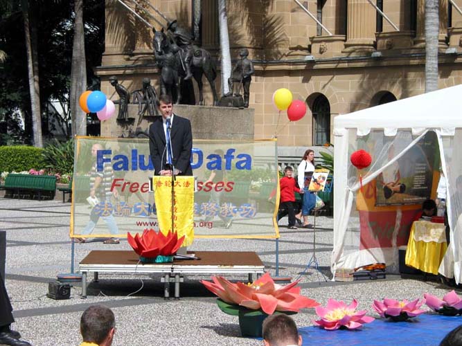 【明慧网2003年5月13日】2003年5月10日,澳洲昆士兰省大法弟子与公众一起在布里斯本市中心的乔治国王广场载歌载舞,共同欢庆5月13日世界法轮大法日。在开幕式上,学员以自己的亲身经历证实了法轮大法给人民和社会带来的裨益和美好,同时深刻地揭露和控诉了邪恶江泽民逆天叛道,残害中国境内无辜法轮功学员的滔天罪行。