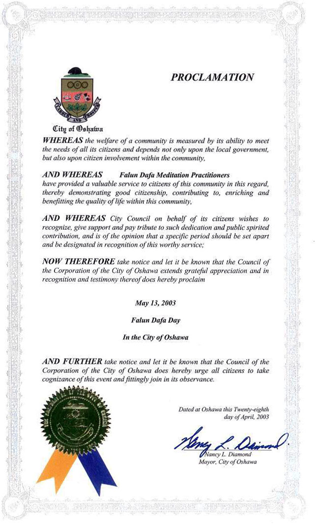 因此,现在宣布奥沙瓦市市政议会向法轮大法修炼者表示感谢,同时承认和公开声明