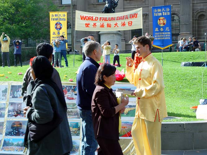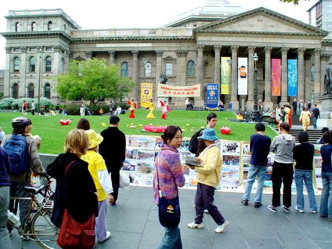 5月10号,星期六,一个阳光明媚的日子,澳大利亚墨尔本法轮大法周在位于市中心的亚若河畔拉开了序幕,学员们身穿鲜艳的中国传统服装,以歌曲、舞蹈、功法演示、图片展览等多种形式来庆祝法轮大法洪传十一周年及世界法轮大法日,人们又从另一个视角看到了法轮大法的美好,有一位老先生从河对岸跑来对我们说:你们真是太美了!