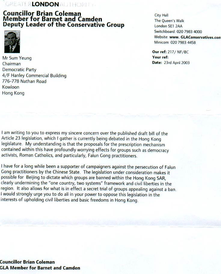 我以此函向你表达我对已公布的23条立法草案的关注,我想此提案也正在香港立法委引起争议。我认为这一包含取缔机制的提案对民主运动,罗马天主教,尤其是法轮功等组织具有非常令人担忧的影响。