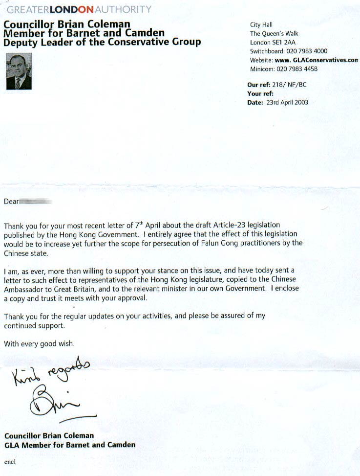 感谢你最近关于香港政府所公布的23条立法草案的来信。我完全同意这一立法将导致中国政府加重对法轮功学员的迫害。