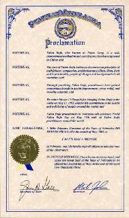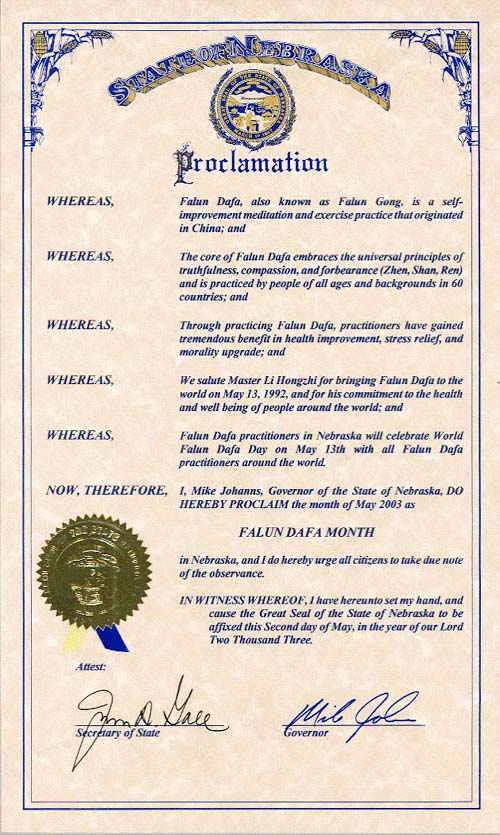 鉴于,内布拉斯加州的法轮大法学员将于5月13日和世界所有法轮大法学员一起庆祝“世界法轮大法日”;