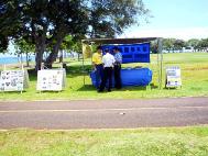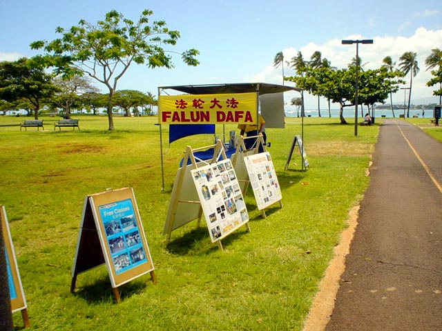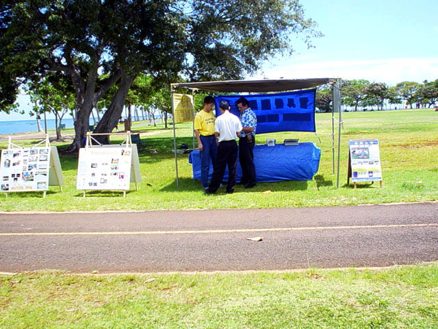 在这普天同庆的世界法轮大法日,五月十三日, 夏威夷大法弟子在 Magic Island, of Ala Moana Park搭起了帐篷,沿着人行小路摆上了图片展板,并有向路人提供的中英文大法材料, 与全世界大法弟子共祝这一伟大节日。