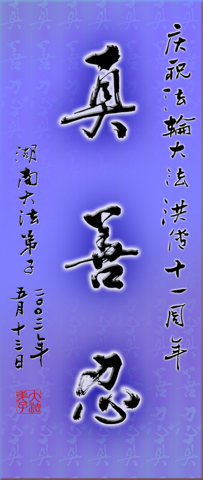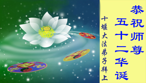 在此,我再代表北京师范大学所有的大法弟子祝师父五十二华诞快乐并恭贺大法洪传十一周年!