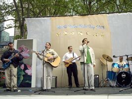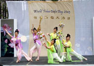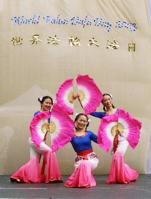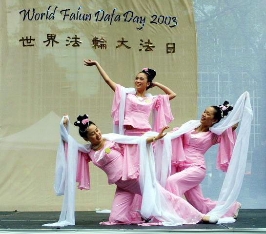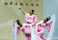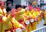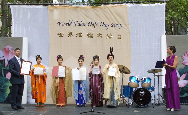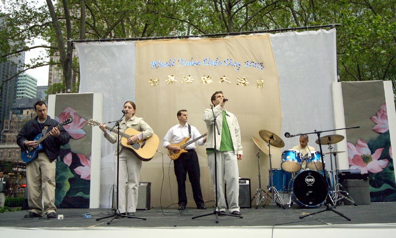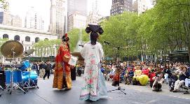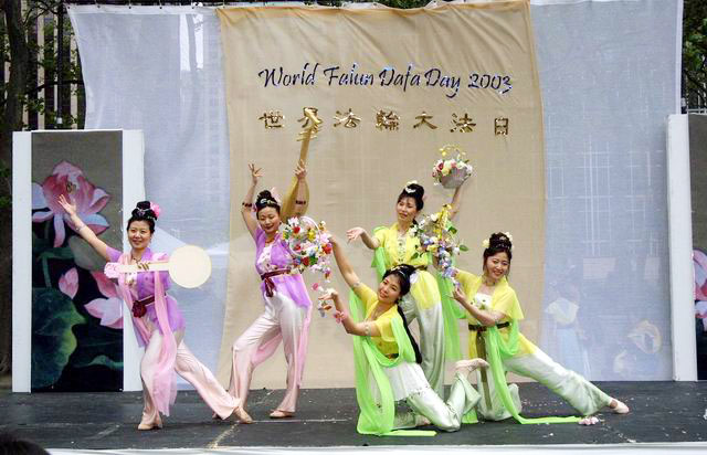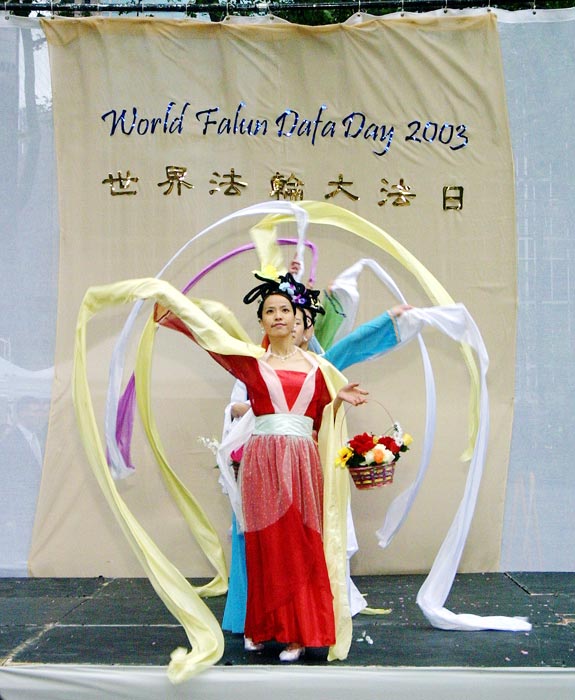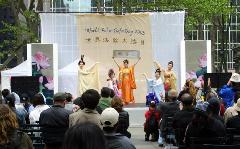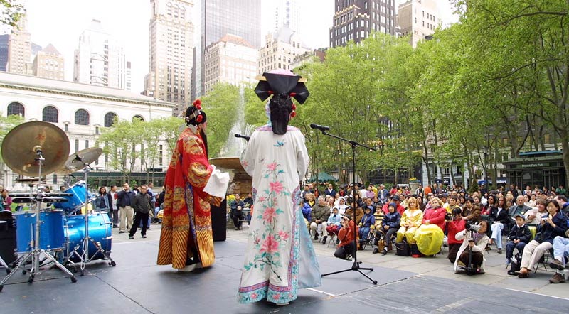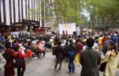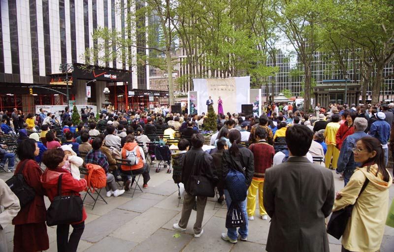 今天主要的庆祝活动是在42街的布莱恩公园进行的。腰鼓队员围绕公园的整齐的鼓声,召唤着人们前来参加这里的庆祝活动。在这里法轮功学员们演出了一台精彩的文艺节目,有具中国民族色彩的舞蹈、戏曲演唱,有西人学员演唱的歌曲和鼓乐伴奏的诗歌表演,有颇具水准的器乐演奏,还有东西方学员一起参加的大合唱,……演出中有十位不同民族不同肤色不同年龄的学员上台,用他们各自的亲身经历,向所有在场的人简明地介绍了修炼大法后的身心受益情况。