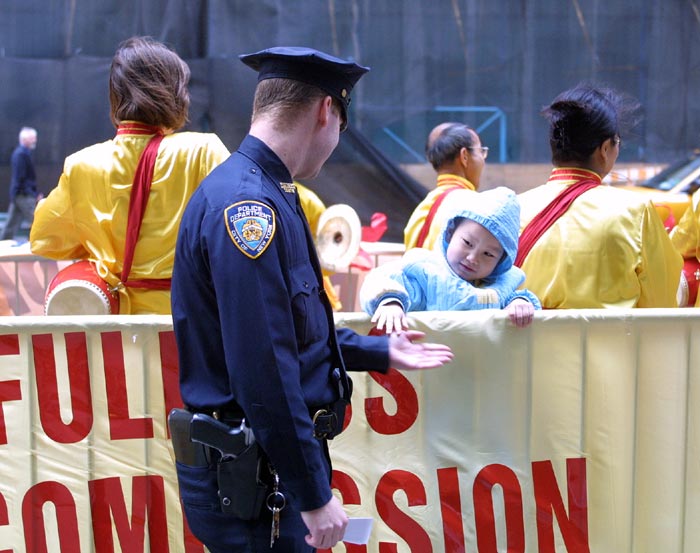 | 小弟子和纽约警察打招呼 | 许多民众在庆典中了解到法轮功真相 |