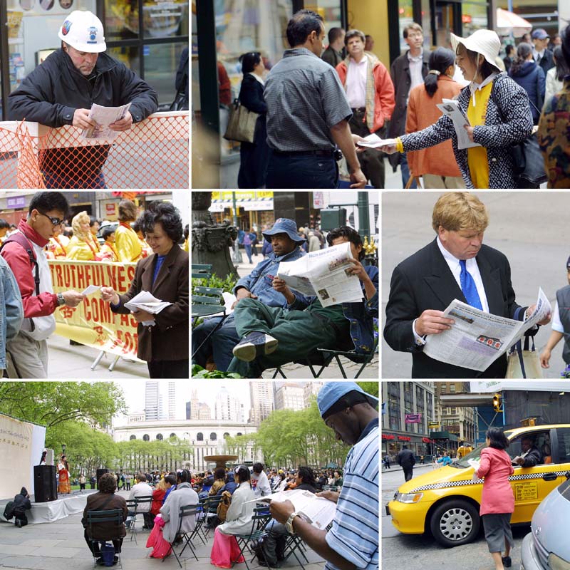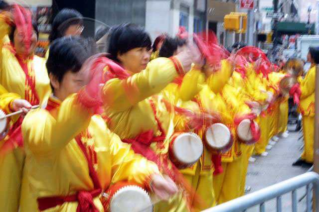 中午,在邻近时代广场的百老汇大街旁,法轮功学员们身着黄色炼功服,以舒缓的功法展示和阵阵欢庆腰鼓拉开了今天庆祝活动的序幕。大法洪传,纽约市民早已熟悉了法轮功,中国江氏集团对法轮功的野蛮镇压,许多人耳濡目染也了解了不少,但对世界法轮大法日不少人还不大知道。看着这些欢乐的法轮功学员,路上的行人停下了脚步,马路上的汽车摇下了玻璃窗,接过学员递上的传单和光盘,听过学员们的介绍,人们微笑着向学员们挥手致意,给学员们以善良的祝福。