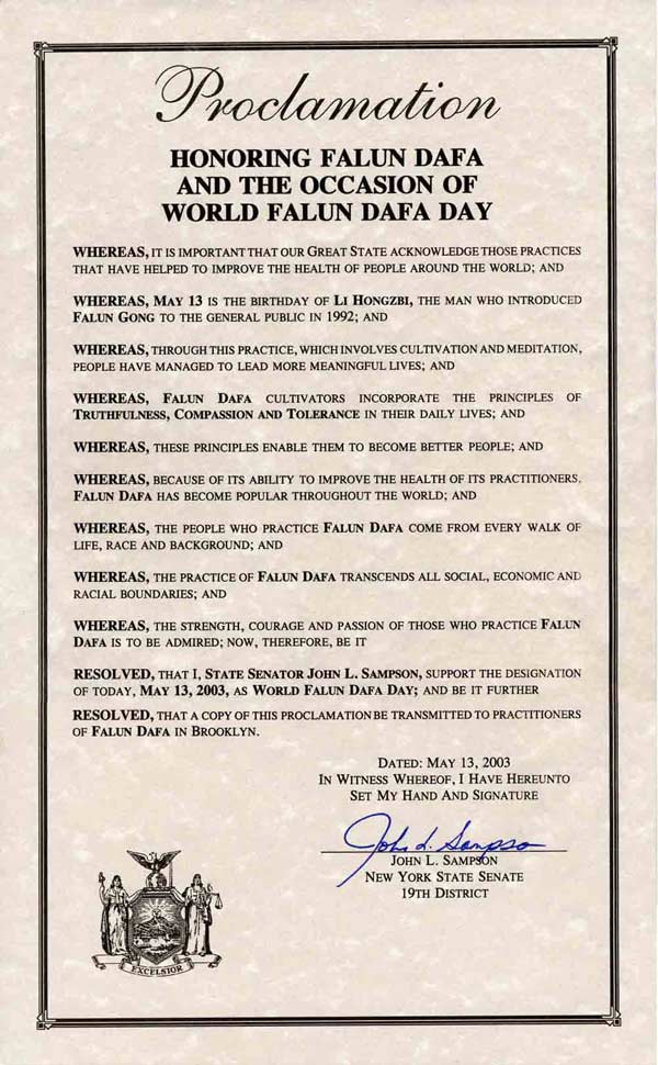 我,纽约州参议员约翰-山普逊决定支持将今日--5月13日命名为世界法轮大法日;