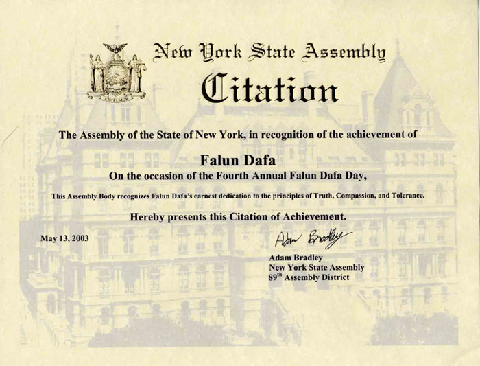 在举行第四届年度法轮大法日之际纽约州众议院表彰法轮大法的成就