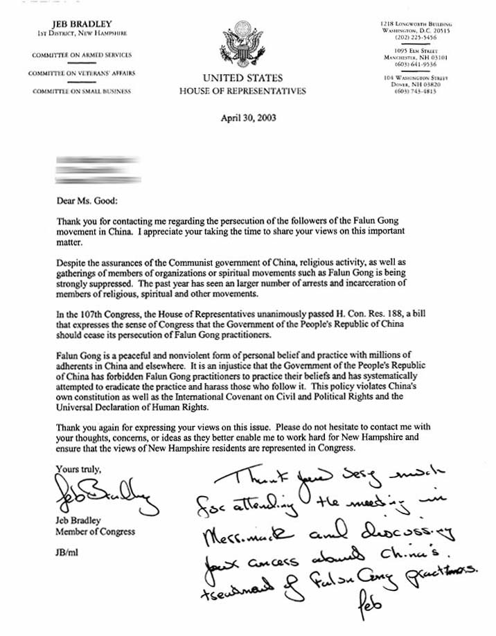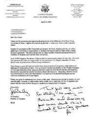 感谢您写信告诉我有关中国对法轮功信奉者的迫害,我感谢您花费时间就这一重要事件表达您的观点。