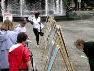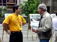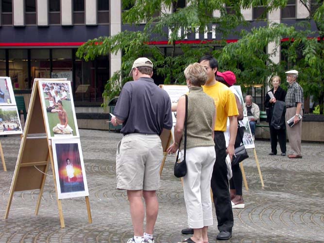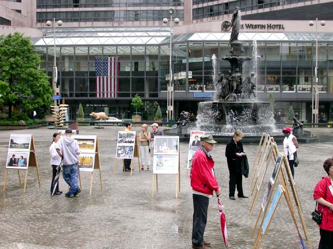 令人惊奇的是,中午时分,当学员冒雨驱车赶到广场时,雨渐渐变小;当展板安置好时,雨停了,风住了,游人出来了,天空也清透起来了。正法之路图片展顺利进行……三小时后,展览结束,当学员离开广场时,雨又象漏了天似的下了起来。