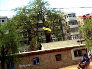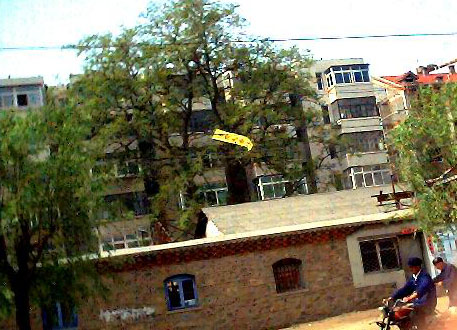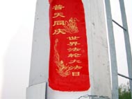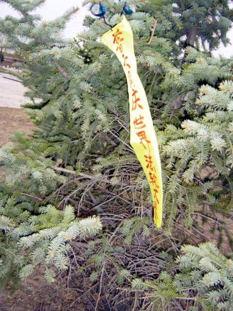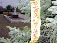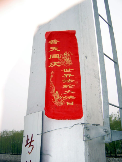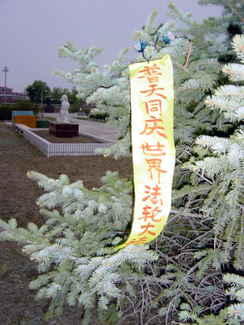 为庆祝世界法轮大法日的到来,5月13日,辽宁某市的街市上飘扬着数条写着“法轮大法好”的真相条幅。