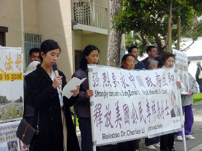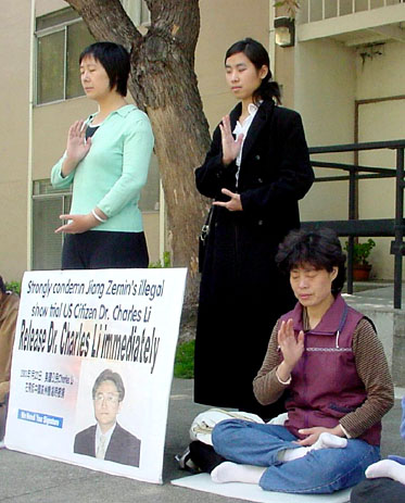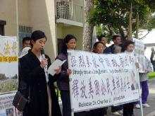 【明慧网2003年5月17日】5月16日下午1点,在旧金山中领馆前湾区法轮功学员为营救李祥春和揭露江××的“群体灭绝罪”等罪行召开了新闻发布会。