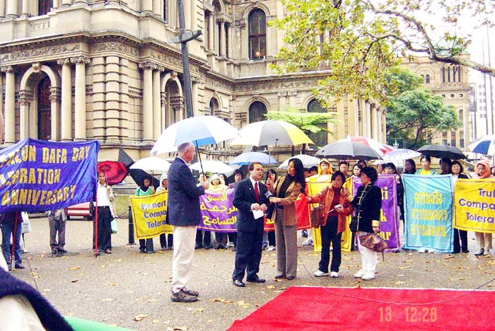【明慧网2003年5月18日】2003年5月13日澳洲法轮大法修炼者从早上8:30分云集到悉尼市中心的TownHall广场,开始了第四届世界法轮大法日的庆祝活动。纽省会上议员出席了庆祝活动并致贺词。晚上7:30分开始了大型法轮大法歌舞晚会。有近千人出席了这一晚会。
