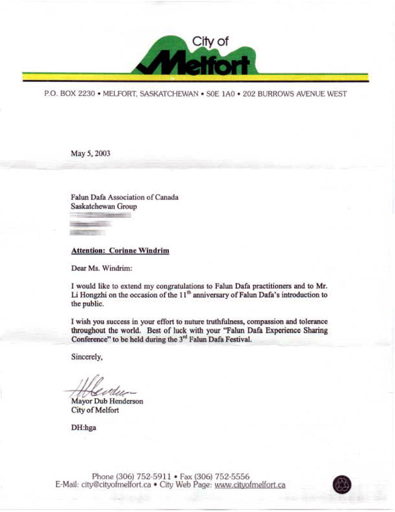 真诚的达布-亨德森(Dub Henderson)市长 (签名)梅尔佛(Melfort) 市