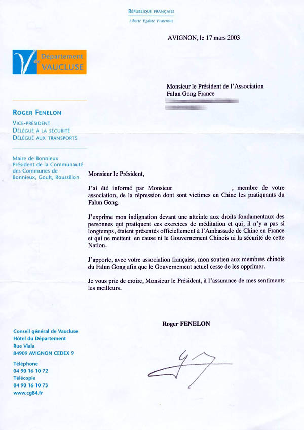 我同你们的法国协会一起,支持中国的法轮功学员并要求政府停止对他们的迫害。