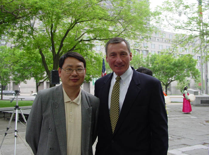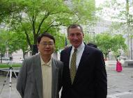 | 费城法轮功学员功法表演 | 法轮功学员与费城市健康部长约翰-多木扎斯基合影 |