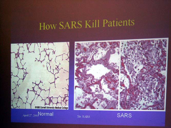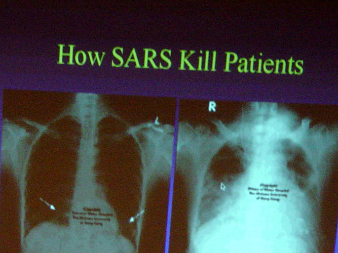 石山表示:“首位在香港扩散SARS病毒的患者,是广东中山大学附属医院中山医院的一位参与治疗SARS病人的医生,他来香港参加亲人的婚礼,并到旅游点观景,他发病的时候,被送入香港医院,他告诉院方自己需要高度隔离,是一种新传染病。”显然,中国方面,在去年11月份开始,通过广东省大量医务人员染病,就知道有一种高传染性病毒开始扩散,但中国政府当时对外宣称:“病情已控制”,并将SARS取命为“非典”。徐医生说:“‘非典’在医学上是由已知的微生物引起的肺炎,它的传染性很低并可以治疗。”〔注:支原体肺炎是非典型肺炎最重要的原因,其它的病原还包括了肺炎衣原体(Chlamydia pneumoniae)、鹦鹉热衣原体(Chlamydia psittaci)、Coxiella burnetii、退伍军人病菌(Legionella pneumophila)与各种病毒。非典型肺炎与典型细菌性(例如肺炎双球菌,pneumococcus)肺炎最大的不同在于:患者没有毒性病容(toxic sign),特别是呼吸不会有呼吸急促(tachypnea)、喂叹音(grunting)、鼻翼煽动(nasal flaring)的现象。这与SARS有根本的区别。〕