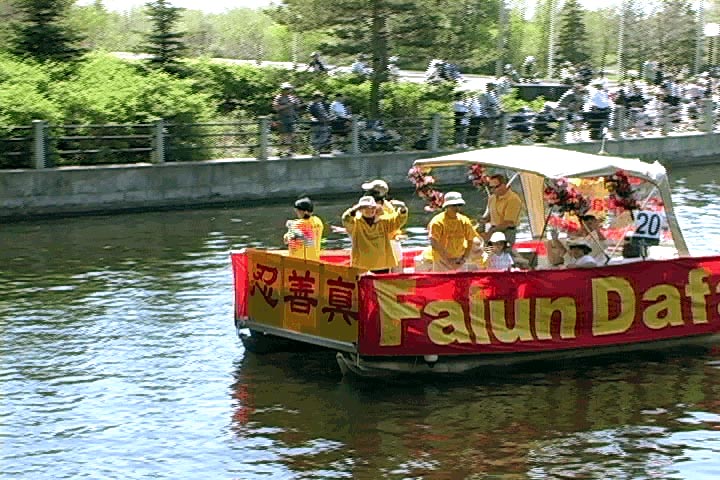 悬挂着巨大中英文“真善忍”和“法轮大法”横幅的船只尤其引人瞩目,船舱上是身着黄T恤的渥太华及蒙特利尔法轮功学员,他们安静、祥和地为观众们连续演示法轮功的五套功法,小弟子们不停地向两岸的人们挥手致意,两岸的观众以掌声,挥手相呼应,表达了人们对法轮大法喜爱。