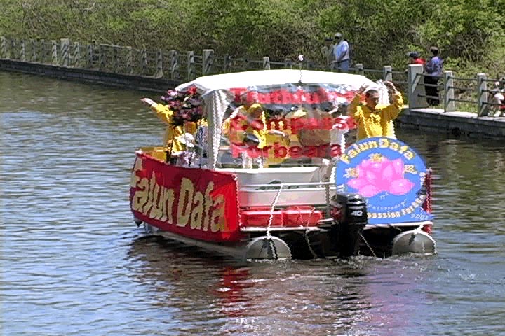 这是法轮功学员第三次参加这一有意义的社区活动,三年前,法轮功学员参加花船游行时,从受江氏集团谎言蒙蔽的华人观众的脸上看到的大多是不解和惊讶。随着法轮功的真相日渐深入人心,当地华人的思想观念在不断地发生着变化。去年的花船游行时,当地华人开始向法轮功学员的渡船队投以微笑。而今年许多华人观众,和其他西方观众一样,不时向法轮功学员的船队报以热烈的掌声,还有几位华人朋友和其他西方观众一道模仿着法轮功学员的动作炼功。