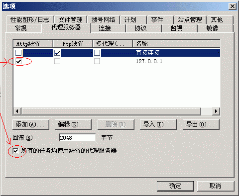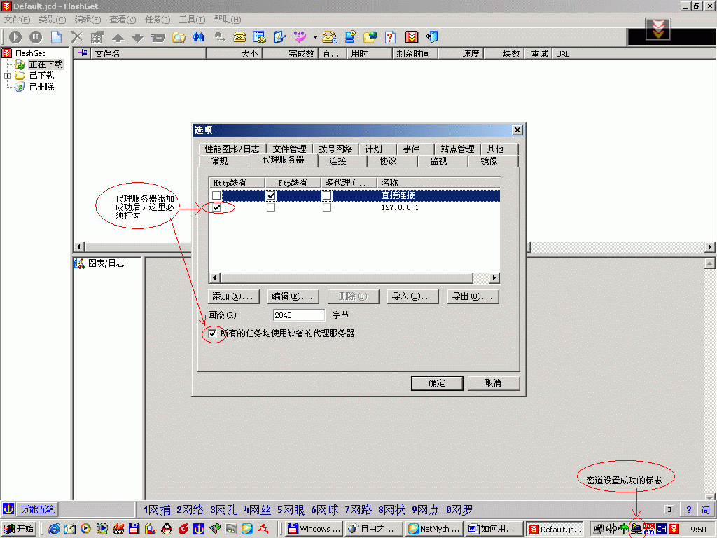 3、打开网际快车,点“工具”-->“选项”-->“代理服务器”-->“添加”-->“名称”随便填,“服务器”填127.0.0.1,“端口”填8081,选中HTTP