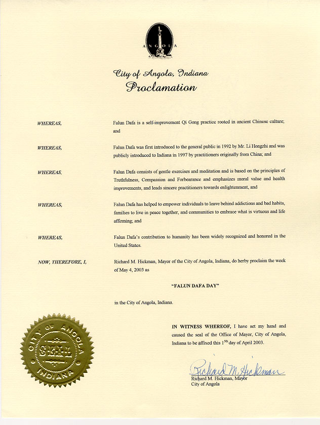 因此,我,理查德希克曼(Richard Hickman),印第安纳州安哥拉市市长,在此宣布2003年5月4日为印第安纳州安哥拉市