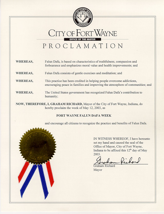 印第安纳州维恩堡(Fort Wayne)市褒奖令鉴于,法轮大法立足于“真、善、忍”的特性,并强调道德标准的提高与健康的改善;并且