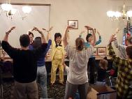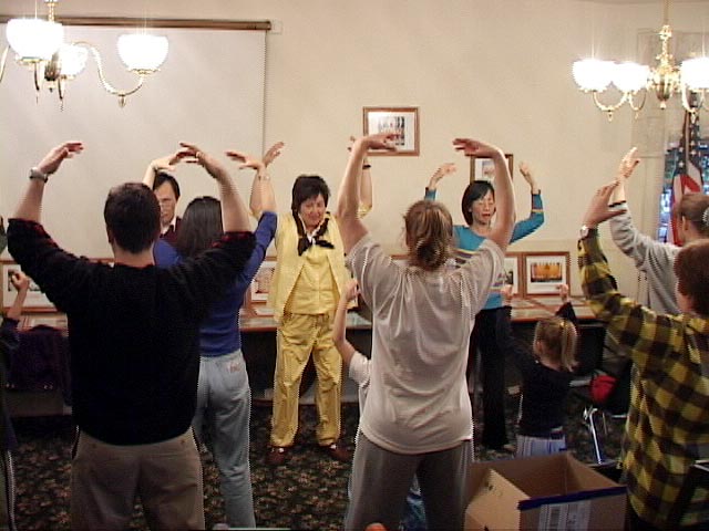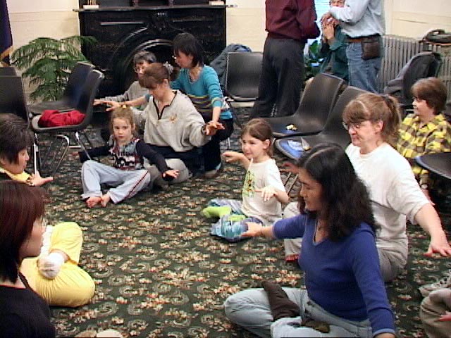 | 小朋友安静的炼习第五套功法 | 当地民众学习动功 | 为大家介绍法轮功 |