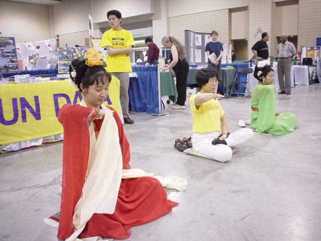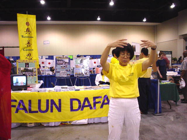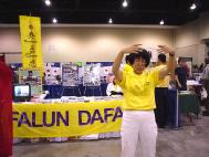 作为维中华人社区的一部分,里士满的法轮功学员,也在大厅内设置了法轮大法展台。高悬着的配有法轮图形的“真、善、忍”彩色条幅极其醒目。学员们把参加这次活动看作是洪扬大法、讲清真相、揭露邪恶的好机会。大家很高兴能够再次把这千载难逢的修炼大法展示和介绍给当地居民。在华盛顿D.C.、诺弗克、沙洛斯维尔同修的共同努力下,法轮大法展台办得极为成功。学员们伴随着舒缓动听的大法音乐向观众演示五套功法,同时,部分学员在展台前解答人们关心的问题。美丽典雅的唐装舞蹈,更衬托出功法的祥和。很多人表示,他们虽然听到过有关法轮功的报道,但亲眼看到大法学员的演示,并亲身处于大法祥和纯正之场中,这还是第一次。不少人表示今后也要去当地的炼功点学炼;还有的记下了有关信息,表示要邀请学员将法轮功介绍给他们的职工或学生。