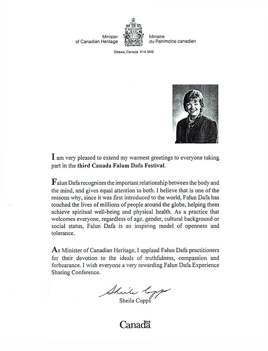 作为加拿大文化传统部长,我为法轮大法修炼者致力追求真善忍的理念而喝彩。我祝愿法轮大法交流会圆满成功。