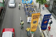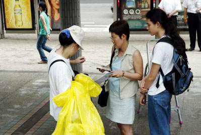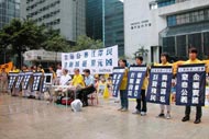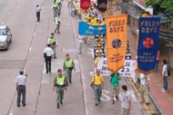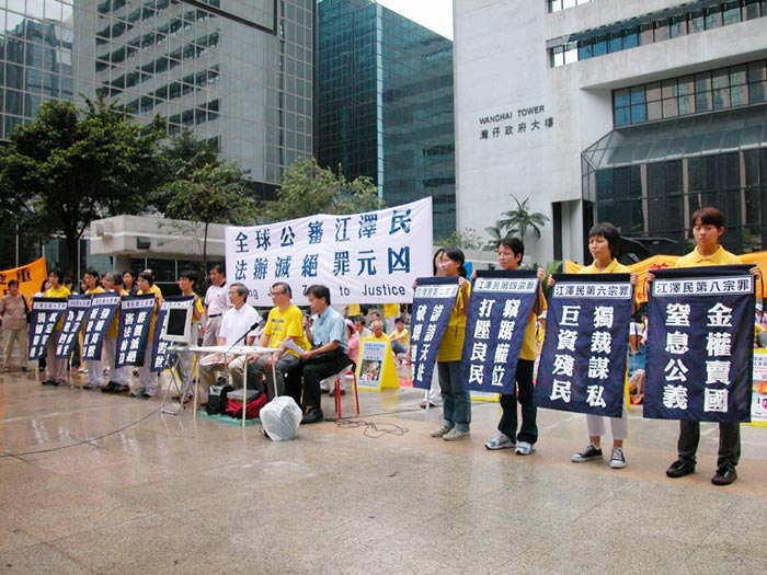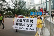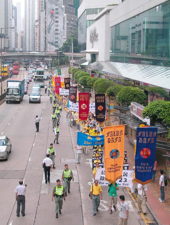 【明慧网二零零三年五月二十六日】「全球公审江泽民,法办灭绝罪元凶」、「捍卫天赋人权,不容恶法祸港」。5月25日,近二百名香港法轮功学员,浩浩荡荡的拉起横幅,由湾仔游行到中环政府总部,向全港市民宣布中国前国家主席江泽民所犯下残暴不仁的「九宗罪」,以及海外法轮功学员正以「群体灭绝罪」把江泽民推上美国联邦法庭的消息。法轮功学员相信「世上所有善良的人们都会从这场全球正义大公审中深深受益」。