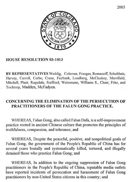 科罗拉多州众议院谴责对法轮功学员的虐待,并褒奖法轮功内在的和平性。