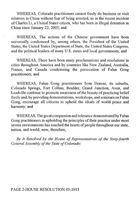 鉴于,科罗拉多州法轮功学员不能在无被捕之忧和自由的情况下在中国经商或探亲,就如美国公民查尔斯-李2003年1月22日以来在中国一直被非法关押的事件;并且