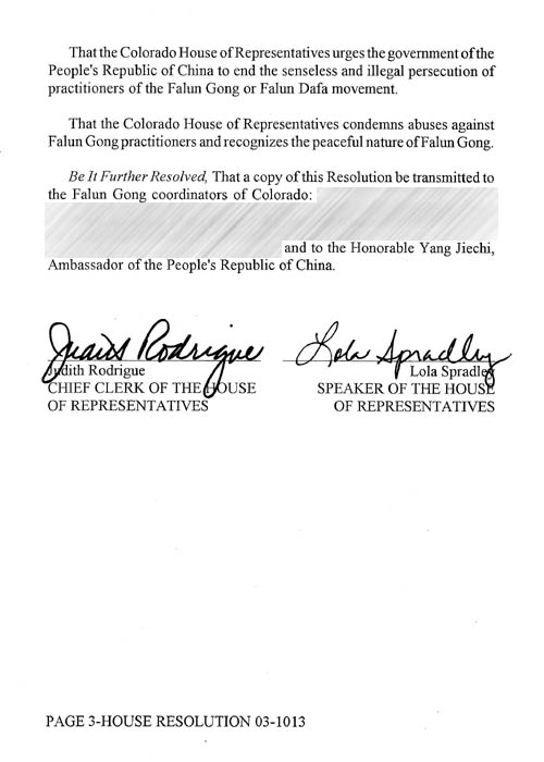 并决定,此决议副本送交给科罗拉多州法轮功[义务]联系人:[人名略],及中国大使杨洁篪。