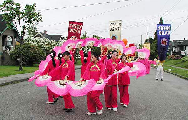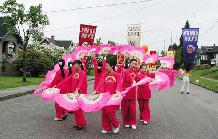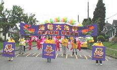 五彩缤纷的车队,喜气洋洋的人们使得这个小城也显得分外热闹。路边站满了观看的路人,法轮功队伍走过时,前面是法轮大法和真善忍的旗,彩车上小学员不停炼着五套功法,后面是优雅的扇子舞和端庄的唐装舞,路人说“真善忍好,我同意,我支持。”