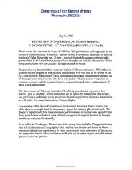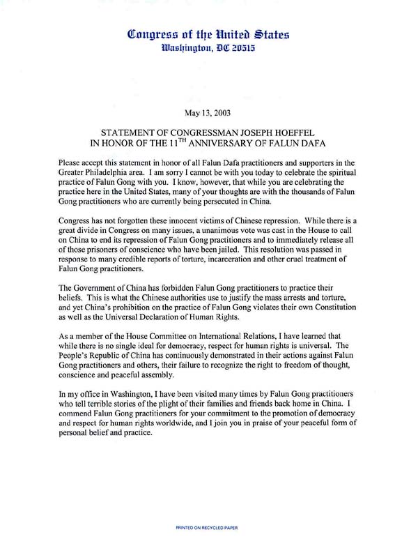 敬请接受我献给大费城地区所有的法轮大法学员和法轮大法支持者们的发言。很抱歉,今天我不能和你们一起庆祝法轮功精神运动。不过,我很了解你们的心情。我知道尽管你们在美国庆祝法轮大法日,你们的心却牵挂着在中国国内正遭受着迫害的成千上万的法轮功学员。